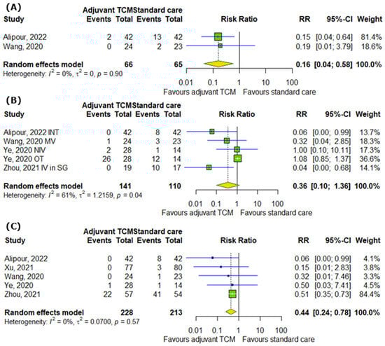 When it comes to the influence of TCM on the number of ICU admissions, the number of cases requiring any supplemental oxygenation, and the number of deaths among COVID-19 patients, our analysis demonstrated that TCM can reduce the risk of ICU admission by 84% (RR = 0.16; 95% CI [0.04; 0.58]; p = 0.0053; I2 = 0%) and the risk of death by 56% (RR = 0.44; 95% CI [0.24; 0.78]; p = 0.0052; I2 = 0%), but non-significantly reduces the risk of requiring any supplemental oxygenation (RR = 0.36; 95% CI [0.1; 1.36]; p = 0.1318; I2 = 61%) (Figure 5A–C).