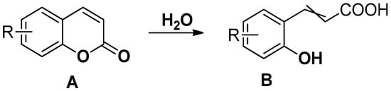 Hydrolysis of coumarin (A) to 2-hydroxycinnamic acid (B).