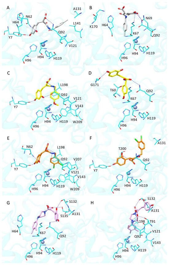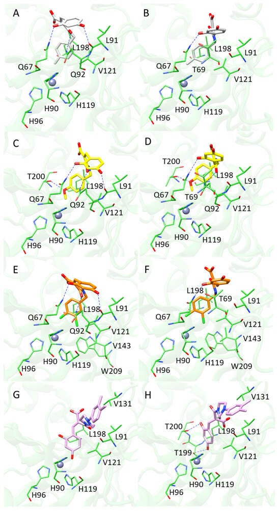 Docking poses of the E/Z isomers of hydrolyzed coumarins 7A, 9A, 23A and 38A into hCA IX. (A) (E)-7A, (B) (Z)-7A, (C) (E)-9A, (D) (Z)-9A, (E) (E)-23A, (F) (Z)-23A, (G) (E)-38A, (H) (Z)-38A.
