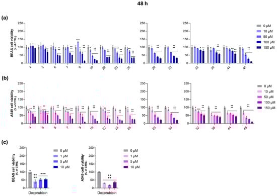 Cell viability of BEAS (a) and (b) A549 cells exposed to increasing concentrations (0–150 µM) of selected compounds (4-7, 9, 19, 22, 23, 25, 29, 30, 32, 38, 44 and 45) for 48 h. (c) Cell viability of BEAS and A549 cells exposed to doxorubicin (0-10 µM) after 48 h of exposure. Bar graphs represent cell viability percentages. The untreated control (CTRL = 0 µM) is set as the 100%. Data are presented as means ± standard deviations obtained from one experiment in triplicates (n = 3). * = p < 0.01, ** = p < 0.001, *** = p < 0.0001, **** = p < 0.00001 comparing treated to the untreated control.