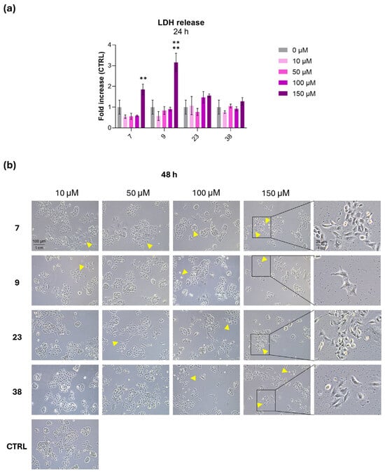 (a) Cytotoxicity occurrence in A549 cells exposed to increasing concentrations (0–150 µM) of compounds 7, 9, 23 and 38 after 24 h. The bar graphs show the amount of lactate dehydrogenase (LDH) released from treated A549 cells as a fold increase respective to that secreted by untreated cells (CTRL = 0 µM) after 24 h of exposure. (b) Light phase-contrast images of A549 cells 48 h after treatment. Magnification 10×. Yellow arrows highlight morphological changes in the cell population. Data are presented as means ± standard deviations obtained from one experiment in triplicates (n = 3). ** = p < 0.001, **** = p < 0.00001 comparing treated to the untreated control.
