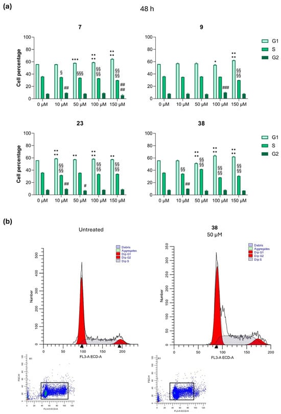 (a) Cell cycle analysis in A549 cells exposed to increasing concentrations (0–150 µM) of compounds 7, 9, 23 and 38 after 48 h. Data are presented as means ± standard deviations from three independent experiments (n = 3). Bars highlight cell percentages in the various phases of the cell cycle (G1, S, and G2) of A549. * = p < 0.01, ** = p < 0.001, *** = p < 0.0001, **** = p < 0.00001 comparing treated with the untreated control (G1 phase). § = p < 0.01, §§ = p < 0.001, §§§ = p < 0.0001, §§§§ = p < 0.00001 comparing treated with the untreated control (S phase). # = p < 0.01, ## = p < 0.001, ### = p < 0.0001, #### = p < 0.00001 comparing treated with the untreated control (G2 phase). (b) The top panel displays the DNA profile of cells 48 h after treatment. Peaks are generated by the emission of PI in the FL3 fluorescence channel. The bottom panel is a dot plot representing the gating strategy.
