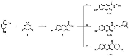 General synthetic procedure for 7-hydroxycoumarin amides 4–45. Reagents and conditions are as follows: (i) CH3COONH4, water, reflux 15 h, 87% yield; (ii) substituted benzylamines, EDCI, HOBt, dry MeCN, r.t. 6 h, 44–92% yield; (iii) substituted phenylethylamines, EDCI, HOBt, dry MeCN, r.t. 6 h, 70–90% yield; (iv) substituted piperazines, EDCI, HOBt, dry MeCN, r.t. 6 h, 47–82% yield.