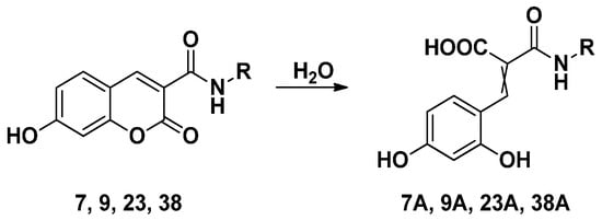 Hydrolysis of coumarins 7, 9, 23 and 38 to 2,4-dihydroxycinnamic acid amides 7A, 9A, 23A and 38A.