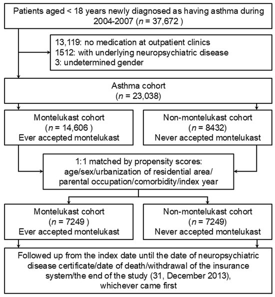 The Taiwan National Health Insurance Research Database (NHIRD) releases a set of sampling files, called the Longitudinal Health Insurance Database (LHID), for research purposes. LHID 2000 contains the original claims data for 1,000,000 beneficiaries randomly sampled from the entire population of NHI beneficiaries in the year 2000. All registration and claims data for these 1,000,000 individuals for the period of 1997–2012 were collected and distributed as LHID 2000. The subjects included in LHID 2000 and those enrolled in the original Taiwan NHIRD do not differ significantly in age, sex, or mean insured amount [51]. A cohort with asthma and non-asthma comparison groups was developed. We identified people with a verified, new diagnosis of asthma in 2000. The definition of asthma diagnosis is to have at least 2 diagnoses at outpatient clinics and to be prescribed at least 1 kind of asthma controller medication (e.g., montelukast, ICS, ICS+LABA). The non-asthma group was made up of those who did not have asthma from 1997 to 2012 and was matched 4:1 with the asthma group by sex, age, and index date. The index date was defined as the date when the patients were first diagnosed as having asthma. Any individuals that had neuropsychiatric disease prior to the index date were excluded from this study. The two study groups were followed up from the index date until the date of issuance of neuropsychiatric disease certificates, the date of death, or the end of the study (31 December 2012), whichever came first. All data were calculated with SPSS 18.0 software for descriptive statistics and contingency tables (SPSS, Inc., Chicago, IL, USA). Kaplan–Meier survival analysis and Cox regression were used. A value of p = 0.05 was considered statistically significant.