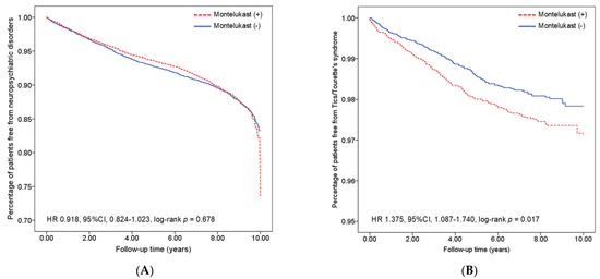 Kaplan–Meier analysis of the two groups. The analysis showed (A) no significant difference in neuropsychiatric disease-free rates between groups (log-rank test, p = 0.678) and (B) a significantly lower disease-free rate for Tics/Tourette’s syndrome (log-rank test, p = 0.017) in montelukast users.