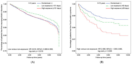 The Kaplan–Meier analysis showed (A) children aged 0–6 years with less than 101 days of montelukast had a significantly lower neuropsychiatric disorder-free rate (p = 0.019) and (B) children aged 6–15 years with more than 63 days of montelukast had a lower Tics/Tourette’s syndrome-free rate (p = 0.005).