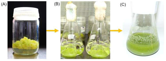 Establishment of the liquid suspension culture cells of P. taxifolius HupS21 line: (A) grown of friable calli on solid media; (B) calli grown in liquid media in three-baffled flasks; and (C) cell suspension culture.