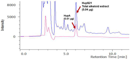 HPLC profiling of the HupS21 total alkaloid extract (blue line) and the huperzine A standard (red line). Chromatographic conditions: C18 column, mobile phase of H2O/TFA (0.0125%):CH3CN (85:15), at 1 mL/min, and detection at 310 nm.