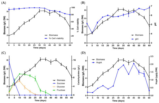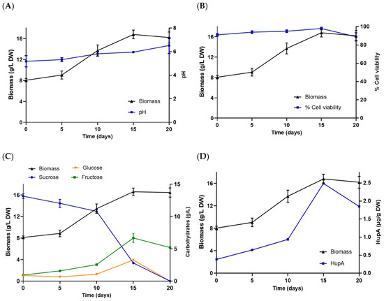 Kinetic study and production of HupA in cell culture of P. taxifolius HupS21 line grown in 2-L airlift bioreactor: (A) cell viability; (B) pH; (C) carbohydrate consumption; (D) HupA production. Bars represent ± SD (n = 3). See Table S3: R2 biomass vs. depletion of carbon source; and Table S4: R2 biomass vs. HupA production.