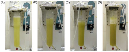 HupS21 line scale-up in 2 L airlift bioreactor: (A) day 0; (B) day 10; (C) day 15; and (D) day 20. The medium B5 was supplemented with NAA (0.5 mg/L), ZT (0.5 mg/L), CW (20 mL/L), sucrose (20 g/L), polyvinylpyrrolidone (PVP) at 1 g/L, and potassium nitrate at 5 g/L.
