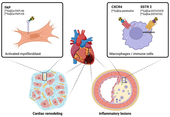 Schematic representation of gallium-68-labeled radiopharmaceuticals and their targets in the context of cardiovascular diseases. [68Ga]Ga-DOTATATE and [68Ga]Ga-DOTATOC accumulates in macrophages and inflammatory cells via endocytosis after binding to the somatostatin receptor type 2 (SSTR2). Molecular imaging of vascular inflammation can also be monitored by targeting C-X-C chemokine receptor type 4 (CXCR4) using [68 Ga]Ga-pentixafor. Cardiac remodeling following myocardial infarction implicates activated myofibroblasts that overexpress fibroblast activation protein (FAP).
