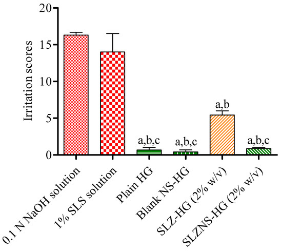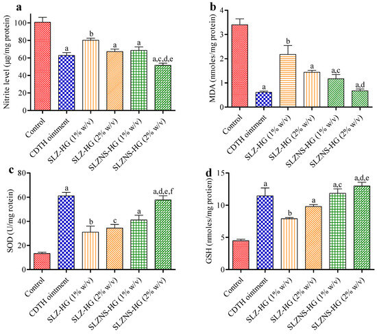 | 6. | SLZ-NS 2% hydrogel | 28.73 ± 1.19 a,b,d,f | 74.77 ± 1.77 a,b,c,f | 62.76 ± 2.99 a,b,e,f |