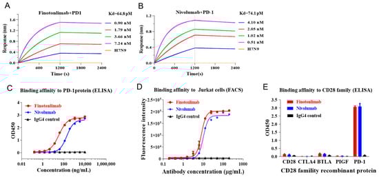 The affinity and binding specificity of finotonlimab to hPD-1 were evaluated using Octet and cell-based assays. (A) Bio-layer interferometry was employed to determine the binding avidity of finotonlimab (A) and nivolumab (B) to hPD-1. (C) ELISA was performed to assess the binding affinity of finotonlimab and nivolumab to hPD-1 protein (n = 3). (D) The binding affinity of finotonlimab and nivolumab to PD-1 -overexpressed Jurkat cells (n = 3). (E) The binding affinity of finotonlimab and nivolumab to homologous proteins, such as CD28 and CTLA-4 (n = 3).