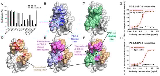 Finotonlimab blocks the binding of PD-1 ligands to PD-1 and its epitope mapping. (A) Binding ratio of PD-L1/finotonlimab with various PD-1 mutants. (B) PD-L1 binding sites on PD-1 are depicted in light blue, while binding sites identified through mutation experiment are highlighted in blue. (C) PD-L2 binding sites on PD-1 are shown in green. (D) Epitopes of finotonlimab, identified by docking simulation and mutation experiment, are displayed in light red and red, respectively. (E) Binding sites of both PD-L1 and finotonlimab on PD-1 are illustrated, with overlapping regions highlighted in magenta. (F) Binding sites of both PD-L2 and finotonlimab i on PD-1 are shown, with overlapping regions in magenta. Competitive inhibition rates of finotonlimab against the PD-L1/hPD-1 and PD-L2/hPD-1 are presented in (G,H), respectively (n = 3).