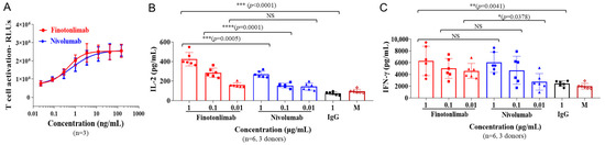 The influence of finotonlimab on T cell function was evaluated using a T cell reporter assay and mixed lymphocyte reaction (MLR). To demonstrate the effect of T cell activation, we employed a PD-1/PD-L1 blocking bioassay system comprising Jurkat-PD-1-NFAT-Luc cells (Jurkat cell stably expressing human PD-1 and an NFAT (nuclear factor of activated T cell)-driven luciferase reporter), and CHOK1-PD-L1-TCRa cells (CHO-K1 line expressing human PD-L1 and an engineered TCR activator). As shown in Figure 3A, the functional activation of finotonlimab was assessed by quantifying the luciferase signal intensity in the reporter cells. The results indicated that finotonlimab exhibited potent concentration-dependent activity in promoting T cell response comparable to nivolumab.