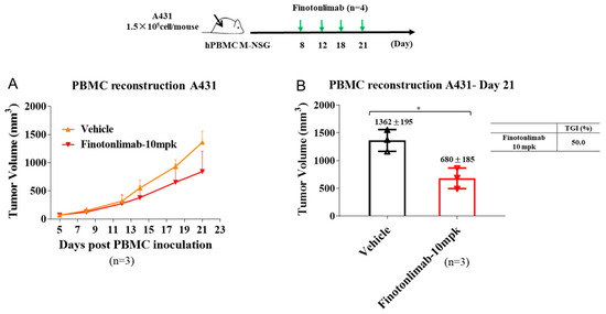 Antitumor activity of finotonlimab monotherapy was evaluated in a PBMC humanized tumor model. The effects of finotonlimab on mouse tumor volume (A,B) in hPBMC humanized mice (A431 human epidermoid carcinoma). * p < 0.05.