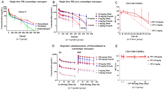 PD-1 receptor occupancy and pharmacokinetic characteristics. (A) Serum concentration-time profiles in serum following single intravenous administration of finotonlimab, nivolumab, or pembrolizumab to cynomolgus monkeys. (B) Concentration-time profiles in serum after single intravenous administration of different dose of finotonlimab to cynomolgus monkeys. (C) PD-1 receptor occupancy profiles on CD3+CD8+CD45RA− cells after single administration of different doses of finotonlimab. (D) Serum concentration-time profiles following repeated administrations of finotonlimab in cynomolgus monkeys (once weekly for 13 doses). (E) PD-1 receptor occupancy following the final administration (13th) of different doses of finotonlimab.