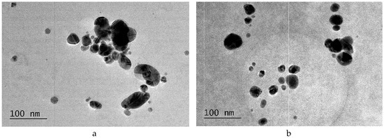 TEM images of (a) AgNPs with MBH (4) and (b) AgNPs with MA (5).