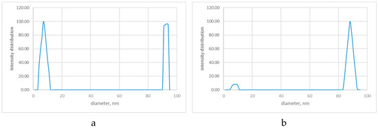 The median average size of the obtained particles was confirmed by DLS (Figure 3). The histograms of both samples (4) and (5) displayed a bimodal particle size distribution, suggesting the presence of aggregates.