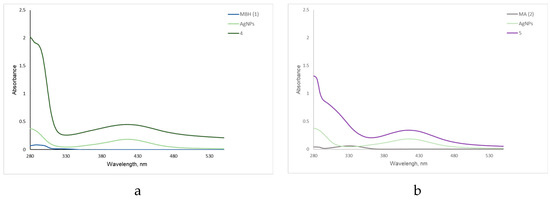 Absorption spectra of (4) and (5): (a) MBH (1)—blue; AgNPs (3)—light green; AgNPs with MBH (4)—dark green; (b) MA (2)—grey; AgNPs (3)—light green; AgNPs with MA (5)—purple.