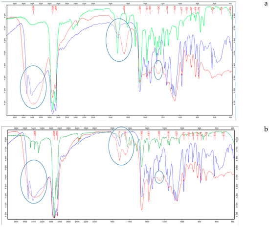 FTIR spectra of (4) and (5): (a) fructose—blue; AgNPs with MBH (4)—red; MBH (1)—green; (b) fructose—blue; AgNPs with MA (5)—red; MA (2)—green.