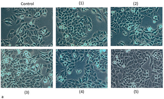 Phase-contrast micrographs of HepG2 cells treated for 24 h (a) and 72 h (b) with substances (1) to (5). Morphological changes in the cells were monitored to evaluate potential cytotoxic effects and alterations in cell structure. Non-treated HepG2 cells were used as the control group to establish baseline morphology and ensure the reliability of the observations. Images were captured at a magnification of 20×, with a scale bar of 50 µm for reference.