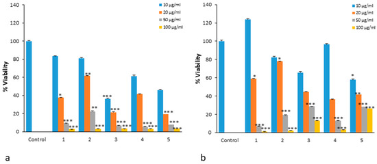 Analysis of cell viability using the WST-1 assay following treatment with substances (1) to (5): (a) at 24 h and (b) at 72 h. Non-treated HepG2 cells served as the control group for baseline comparison. Data are presented as mean ± SEM, with n = 3 independent experiments. Statistical significance is denoted by asterisks, with * p < 0.05, ** p < 0.01, and *** p < 0.001 indicating significant differences between the treated and control samples. These results provide insight into the cytotoxic effects of the tested substances over time.