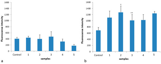 ROS production after treatment with (1) to (5) (a) at the 24th h and (b) at the 72nd h. Non-treated HepG2 cells were used as control. Bars are mean + SEM, n = 3. * p < 0.05; ** p < 0.01; asterisks indicate a significant difference between the sample and non-treated control.