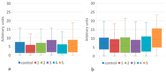 In contrast, after the 72nd h of the treatment, a marked genotoxic effect was observed, particularly for compound (5) (Figure 9b). A slight increase in DNA strand breaks characterized this effect relative to the control group and other treatment conditions. The observed effect may stem from the synergistic interaction between AgNPs and the MA’s structural components, which could potentiate genotoxicity over time. These findings underscore the importance of considering the chemical composition of nanoparticle-based systems and the temporal dynamics of their interaction with biological systems. Prolonged exposure to such materials may compromise genomic stability, raising potential safety concerns for extended treatment duration applications.