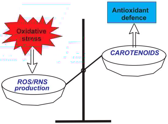 Carotenoids play crucial roles in human overall health, primarily due to their well-known antioxidant effects (Figure 2) []. The ability of seven natural carotenoids to scavenge hydroxyl radicals (HO•), peroxyl radicals (ROO•), hypochlorous acid (HOCl), and peroxynitrite (ONOO−) was assessed in liposomes []. The application of liposomes as model membrane systems to assess the antioxidant capacity of bioactive carotenoids has gained interest due to the structural similarities between liposomes’ bilayer and the lipid composition of cell membranes. The initial two reactive species (HO• and ROO•) are particularly important due to their significant role in lipid peroxidation, which is associated with the onset of atherosclerosis and other cardiovascular diseases [].