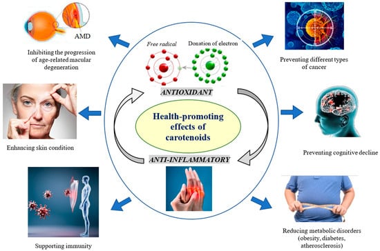 Carotenoids can inhibit the development of AMD, prevent cancer, reduce obesity, prevent neurodegeneration, enhance skin functions, etc. (Figure 3) [,,,]. Recently, a relationship was found between the levels of serum carotenoids and telomere length in obese individuals [].