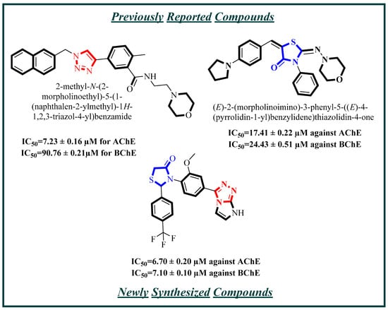 Similarly, a rationale study is also illustrated in Figure 1 to compare the structure and the respective biological profile of newly synthesized compounds with previously reported analogs containing the triazole [] and thiazolidinone [] moiety in their core skeleton. This rationale study shows that the previously reported compounds containing the triazole and thiazolidinone moiety are less effective in inhibiting the enzymes. This reveals the high demand of anti-Alzheimer’s agents with a high efficacy and minimal side effects. For this purpose, we synthesized hybrid compounds of triazole and thiazolidinone, which have strong potential as anti-Alzheimer’s agents. These compounds were analyzed for their inhibition potential via an in vivo analysis. The outcomes of the in vivo study were also studied and validated under an in silico molecular docking study. All the in vivo and in vitro results of the current research study revealed that the lead compounds of the series have the potential to provide the highly necessary treatment for Alzheimer’s disease.