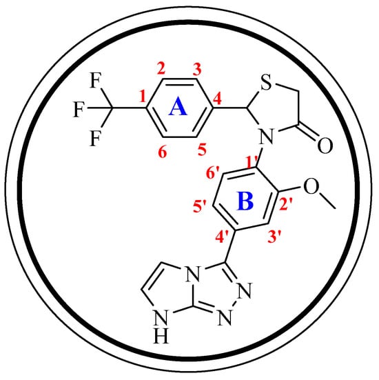 In 13C-NMR, 21 different peaks were observed for each carbon in a molecule. Among them, the highly de-shielded carbon is a carbonyl carbon of the thiazolidinone ring (Figure 2), due to double-bonded highly electronegative oxygen atoms, and appears at 171.4 ppm. The next peak appears at 153.2 ppm and represents the C-2′ of the aromatic ring. At 152.4 ppm, the peak represents the common carbon of the imidazole and triazole ring. The next peak appears for carbon of the triazole ring at 152.1 ppm. It is also de-shielded carbon due to the electronegativity of both nitrogen atoms. At 142.3 ppm, the peak representing carbon 4 is also de-shielded due to the attached thiazolidinone ring. The next peak represents carbon of the imidazole ring attached to the -NH atom and appears at 135.4 ppm. The next peak represents C-1 129.3 ppm, while the next peak represents carbon 3 and 5 due to the attached –CF3 moiety and appears at 129.2 ppm, 129.1 ppm and 128.5 ppm, respectively. The next peak shows that carbon 4′ appears at 127.2 ppm. The next two peaks for C-2 and C-6 appear at 125.3 ppm and 125.2 ppm. At 124.2 ppm, the peak appears for carbon of the triflouromethyl group. The next peak represents carbon 6′, which appears at 123.1 ppm. The next peak shows the C-5′, imidazole carbon and C-3′ appears at 120.3 ppm, 114.4 ppm and 111.1 ppm, respectively. At 72.6 ppm, the peak represents carbon of the thiazolidinone ring between carbon and sulfur atoms. The last two peaks appear at 55.7 ppm and 33.3 ppm, which represent methoxy carbon and the remaining carbon of the thiazolidinone ring. In this way, the complete structure of compounds is elucidated by 1H-NMR and 13C-NMR, which gives information about the number of protons and carbon in molecules and their respective neighboring environment (attached substituents).