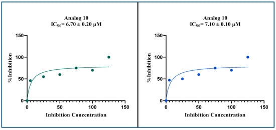Percentage inhibition of analog 10 vs. inhibitor concentration, which illustrates the drug–dose relationship against AChE (left) and BChE (right).