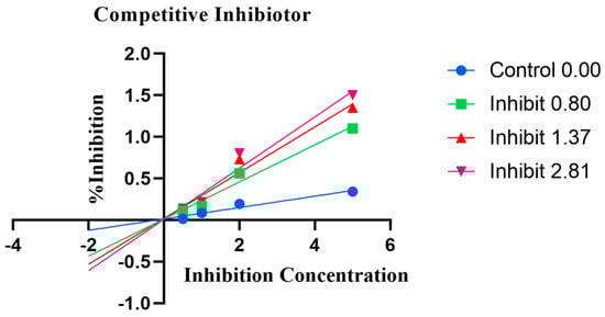 This is an in vitro approach, which measures the initial inhibition rate with the change in the inhibitor concentration. It explains the mechanism of action for how the inhibition rate varies with the passage of time by changing the inhibitor concentration, and the resulting curves or slopes show different competence levels of inhibitors, like a competitive inhibitor, uncompetitive inhibitor and non-competitive inhibitor. In this research study, analog 10 shows the maximum inhibition with strong binding affinity and was found as a competitive inhibitor. Its enzyme kinetic slopes show that they have a similar y-intercept and fight effectively to bind with the enzyme active site in comparison to the substrate binding affinity. The moderate biological profile of analog 9 leads to its uncompetitive inhibition, which is also illustrated through a kinetic study graph. It shows the number of parallel lines having different y-intercepts, and Km and Vmax gradually declined, which reduce the binding affinity of the inhibitor for the enzyme, as compared to a normal substrate. Similarly, poor inhibition or non-competitive inhibition were shown by analog 5 due to attached bulky substituents. The Km constant remains unchanged while having a different y-intercept. This inhibitor binds to the allosteric site of the enzyme and shows minimum inhibition.