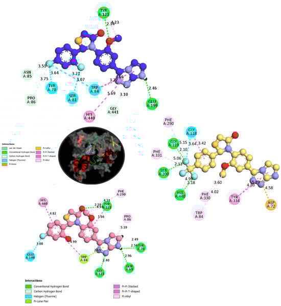 Analog 3 also has a better biological profile (8.10 and 8.50 µM) than donepezil due to ortho and para-flouro substitutions. Both the imidazotriazole and thiazolidinone rings, along with the varied substituted phenyl ring and fluorine atoms, make strong forces of interactions to bind with the enzyme and reduce the substrate binding affinity with the targeted protein complex. The activated phenyl ring due to the electron-donating effects of fluorine atoms in the favorable position of attachment also makes several pi-pi-stacked and other polar interactions with electrophilic moieties in a targeted protein complex. Both flouro atoms lead to hydrogen bonding and cause confirmation rigidity in a molecule. It helps the ligand to better orient in a targeted protein complex without any major change in the optimal binding confirmations. It also increases the lipophilicity of a molecule and acts as a bioisostere, which leads to the compound’s ability to create new and stable interactions by maintaining its binding affinity. Moreover, analog 11 also exhibits significant biological potency (8.30 and 8.60 µM) and holds ortho-hydroxyl and para-flouro groups (Figure 3). –OH leads to hydrogen bonding interactions by both O and H atoms as well as increasing the nucleophilicity of the phenyl ring by donating a lone pair of electrons. This ring further leads to different interactions, mostly including pi-pi stacking with aromatic residues of targeted amino acids. Similarly, fluorine atoms increase the conformational rigidity of a molecule, producing hydrogen bonding and enhancing the lipophilic character. So, both –OH and –F moieties show synergetic effects and inhibit enzyme activity through strong interactions. Both substituents sterically hinder the enzyme active site and do not allow normal substrates to bind with enzyme active sites. When the hydroxyl position changes to the meta-position, its activity declines (10.40 and 10.90 µM), as observed in analog 12 (Table 2). In the ortho-position, the –OH moiety makes strong hydrogen bonds, but at the meta-position, its ability is reduced. Similarly, the nucleophilicity of the phenyl ring is also reduced to the minimum electron donation by the hydroxyl group at the meta-position. It is near the fluorine atom and might become involved in hydrogen bonding with it. So, this also sterically hinders the activity of the flouro group. The interactive properties of both groups were disturbed, which were observed in analog 11, due to a change in position. When the hydroxyl group is replaced with a nitro moiety, the potency is significantly reduced to 16.20 and 16.70 µM, as in analog 13. This might be due to the nitro moiety being involved in making interactions within a molecule and also giving a molecule structural confirmation, in such a way that it does not fit into the active sites of the targeted enzymes. Analog 9 shows somewhat moderate potential, as compared to donepezil, as it holds meta-substitutions of the flouro and hydroxyl moiety. In this case, both attached moieties are far from each other and have less steric hindrance, as compared to analog 12. So, they are capable of making a few binding interactions with the amino acids of the targeted enzymes.