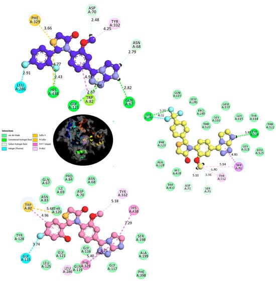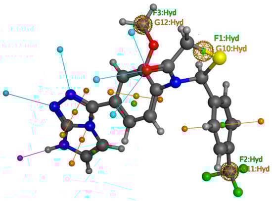 To further confirm the docking results and to better understand the interactive nature of the attached substituents responsible for the effective binding affinity of ligands in a targeted protein, Pharmacophore modeling was carried out []. This analysis critically evaluates and investigates the substituents, heteroatoms and each component of a molecule, which were involved in making strong and effective interactions, especially hydrogen bonding. The results show that these analogs have specific bioactivity profiles and effectively held in the binding pockets of the targeted protein complex, through different forces of attraction. The fluorine atoms of the –CF3 group, sulfur atoms and methyl group of methoxy were involved in strong hydrogen bond interactions, which were responsible for the bioactivity of analog 10, as shown in Figure 9.