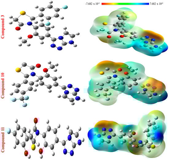 Electrostatic potential surface for analog 3, 10 and 11, illustrating molecular arrangement and electrophilic as well as nucleophilic regions.