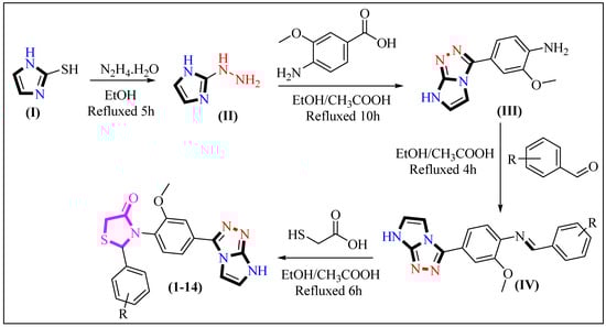 These imidazotriazole-based thiazolidinone derivatives were synthesized using an effective synthetic approach consisting of a four-step reaction. In this reaction, 1H-imidazole-2-thiol was used as a precursor molecule, which was allowed to react with hydrated hydrazine in an ethanol solvent under continuous heating and stirring conditions for about 5 h to obtain 2-hydrazinyl-1H-imidazole as an intermediate moiety. In the next step, this intermediate was cyclized by reacting with 4-amino-3-methoxybenzoic acid under the catalytic effect of acetic acid in ethanol to give the 4-(7H-imidazo[2,1-c][,,]triazol-3-yl)-2-methoxyaniline moiety as the second intermediate. In third step, again in ethanol and acetic acid, this moiety was treated with a varied substitution containing benzaldehyde to afford imidazotriazole-based Schiff base derivatives. In the last step, a cyclization reaction occurred between the intermediate (III) and thioglycolic acid to obtain imidazotriazole-based thiazolidinone derivatives (as shown in Scheme 1) under the same reaction conditions (ethanol, acetic acid and reflux for about 6 h). These derivatives have an appropriate yield and were further purified by washing with n-hexane. At the end, solvents were evaporated, and fine products were collected to further elucidate their structures via 1H-NMR and 13C-NMR. The molecular weight of these molecules was calculated to further confirm their synthesis by HREI-MS. In each step, product confirmation was achieved through single and clear spots on TLC plates. The melting point, percentage yield, retardation factor (Rf) and color of novel synthesized imidazotriazole-based thiazolidinone derivatives (1–14) are given in Table 1.