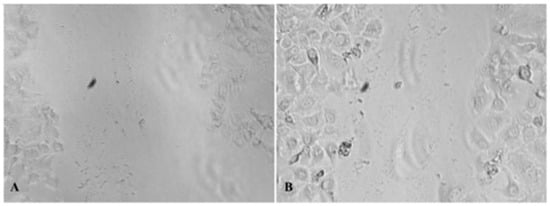 (A): In vitro wound healing of the mixture—0 h; (B): in vitro wound healing of the mixture—24 h, magnification 10× (photograph taken with Nikon camera, under Zoom 33%).