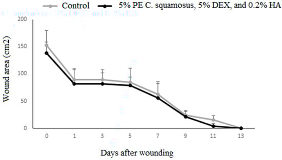 Wound closure dynamics following application of the mixture containing the PE of C. squamosus, DEX, and HA. Results are presented as a percentage of the initial wound areas (mean ± S.D. for a total of 9 animals per time point, per group, from two independent experiments). Data are analyzed using ANOVA with Tukey’s multiple comparisons test.