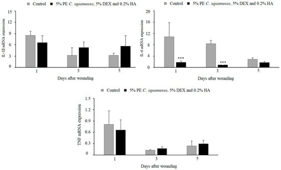 The results we obtained for in vivo wound healing indicated no differences in IL-1β and TNF response between the control and treated group, while IL-6 was lower at days 1 and 3 post-wounding in wounds treated with the mixture containing 5% PE of C. squamosus, 0.2% HA, and 5% DEX (Figure 3). The effects of these components on the inflammatory phase of wound healing were assessed by measuring the expression of IL-1β, IL-6, and TNF at days 1, 3, and 5 post-wounding. Lower IL-6 in wounds treated with the mixture might contribute to the discrepancy between in vitro and in vivo results, reducing the positive effect noted in keratinocytes. It might be assumed that the effect of the mixture on other cell types present at the wound site (immune and non-immune) is absent or suppressed.