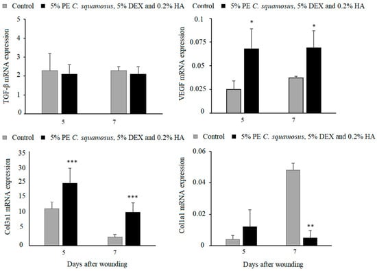 As for the gene expression analysis for TGF-β, VEGF, collagen 1, and collagen 3, key molecules in the proliferative phase of wound healing, results revealed similar TGF-β in both groups, higher VEGF and collagen 3, but lower collagen 1 at day 7 post-wounding in treated animals (Figure 4). Additionally, the expression of VEGF and collagen 1 and 3 began on day 3 in the treated group, compared to day 5 in the control group.