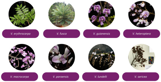 Photographs of the Vatairea species. The images of V. erythrocarpa, V. fusca, V. guianensis, V. heteroptera, and V. macrocarpa were provided by Domingos Cardoso and are sourced from the Reflora website [2]. The photograph of V. paraensis is credited to L. O. A. Teixeira, also from the Reflora website [2]. Images of V. lundelli and V. sericea were obtained from the Trópicos website, with photos by Aguilar Fernandez [10] and MBG [11].