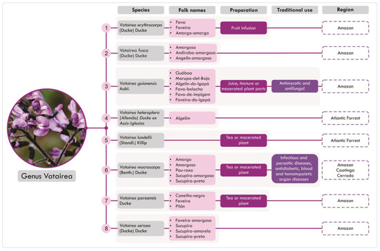 Thus, the eight species of Vatairea, native to Brazil, often have similar popular names and applications in traditional medicine, related to treating infections and inflammatory processes, but also applied to treating endocrine diseases. The preparation forms observed are also diverse, including juices, tinctures, teas, and macerations, which may indicate different solubility patterns to the diverse medicinal properties reported by traditional people [2,4,13,22,23,24].