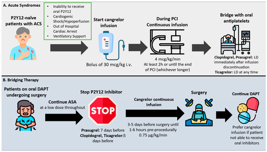 The role of cangrelor as a bridge for emergent cardiothoracic surgery and, most importantly, coronary artery bypass surgery (CABG) was recognized early, given the immediate offset of action of this agent, compared with oral P2Y12 inhibitors. The landmark study for this indication was the BRIDGE study [91], which randomized patients to either receive cangrelor or placebo infusion for at least 48 h after thienopyridine interruption, which was continued for 1–6 h after cardiac surgery. The primary efficacy endpoint was platelet reactivity, while the main safety endpoint was coronary artery bypass graft (CABG)-related bleeding. Regarding platelet activity, patients under cangrelor treatment had significantly higher rates of P2Y12 reactivity units below 240 (98.8 vs. 19.0%; p <0.001), while there was no evidence of a significant difference in CABG-related bleeding events between the two arms (11.8 vs. 10.4%; p = 0.763). Similar results have been reported in other cardiac surgery, real-world series, evaluating patients with implanted stents and supporting bridging with cangrelor [92], as well as in case series of emergency CABG, where cangrelor infusion allowed timely reversal of the antiplatelet effect without delays related to the longer offset of oral antiplatelet agents [93]. Considering these results, as well as results in non-cardiac surgery [94,95], the use of cangrelor is increasing in elective cases at high risk, with recent PCI and under DAPT treatment in order to provide sufficient antiplatelet coverage in the periprocedural period. However, there is a need for further trials evaluating the use of cangrelor in ACS patients undergoing emergent CABG, as it could provide a safer than oral antiplatelet options due to its immediate offset of action.