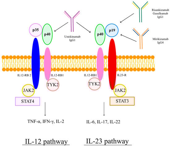 Mechanism of action of IL-23 antagonists: ustekinumab, risankizumab, guselkumab, and mirikizumab [,,,].