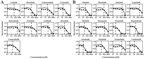 Individual plots of TKIs on survival fraction of hiPSC-CMs for TKIs with no cardiotoxicity (A) and TKIs with cardiotoxicity (B).
