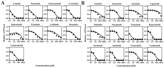 Individual plots of TKIs on relative ATP level of hiPSC-CMs for TKIs with no cardiotoxicity (A) and TKIs with cardiotoxicity (B).